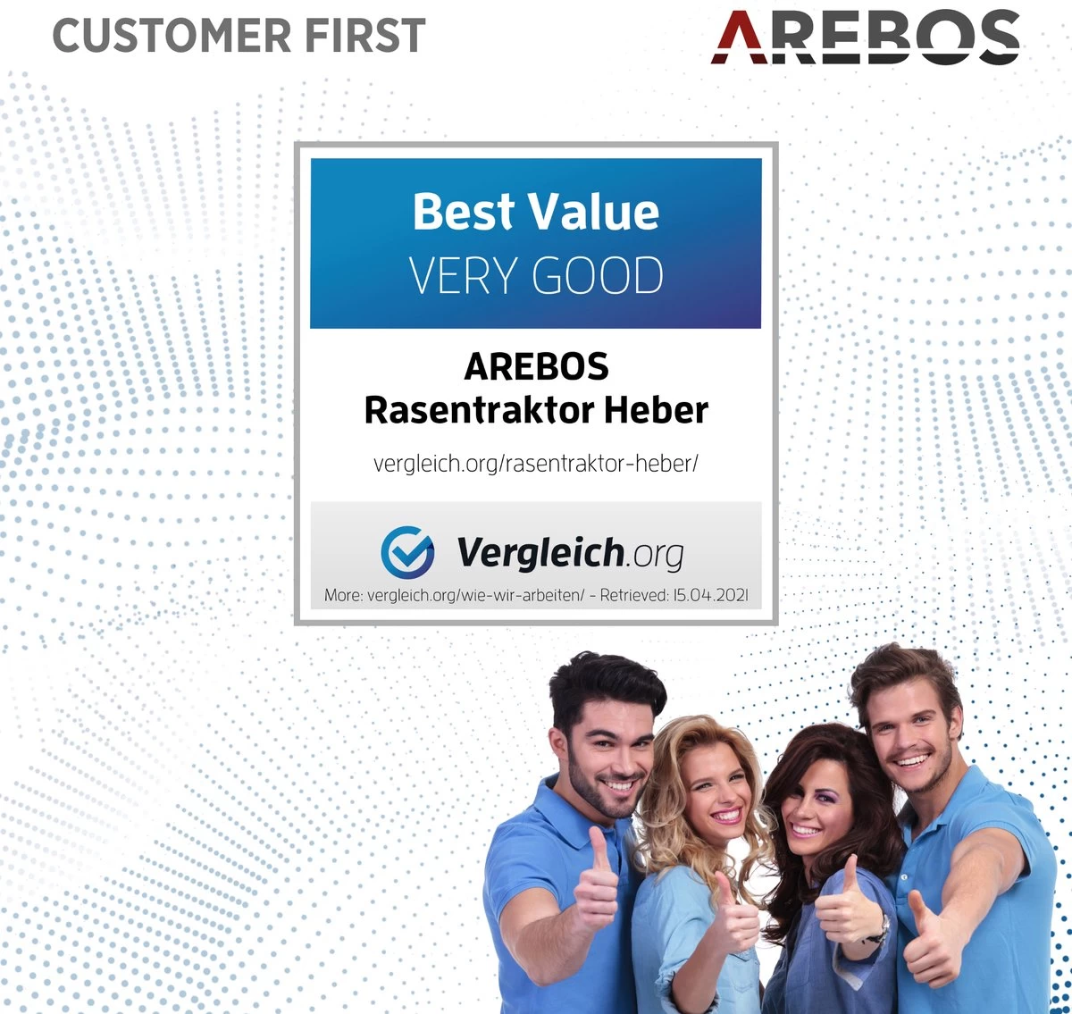 De AREBOS zitmaaierkrik is stabiel en staat stevig op de grond. De hellingshoek is traploos instelbaar tot ca. 45°. Ook bespaart het toestel u ruimte wanneer u het opklapt om op te bergen.