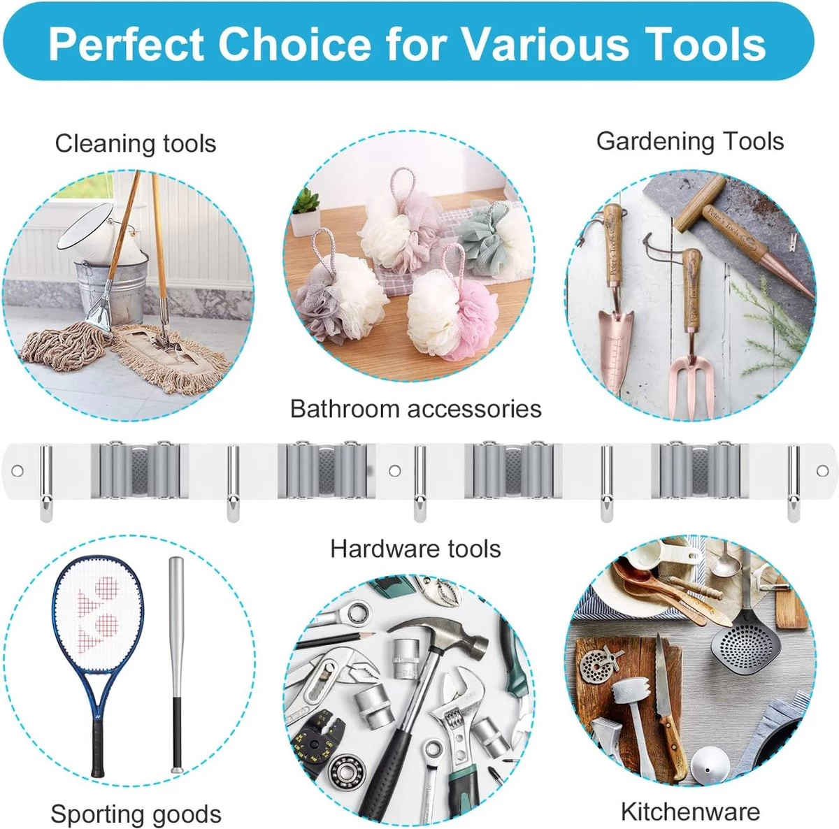 【Ruimtebesparend en gemakkelijk te gebruiken】 Met 5 rekken en 6 haken biedt deze bezemhouder-muurbevestiging in totaal 9 ophangposities voor uw gereedschap, waardoor uw ruimte maximaal wordt bespaard.