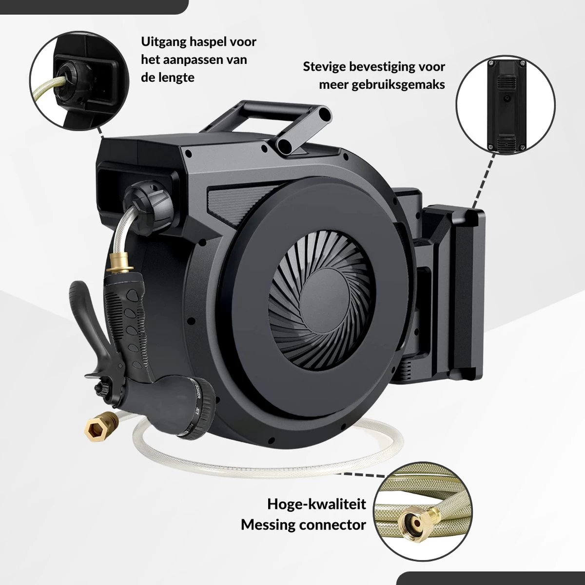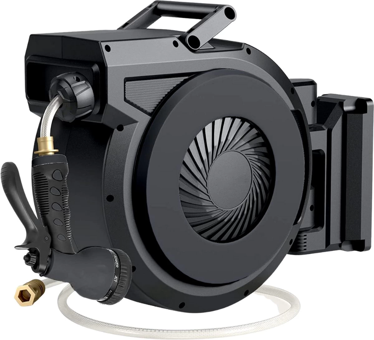 Buxibo – Wandslangenbox 20 Meter + 2 Meter – Tuinslang Met Haspel – 9 Sproei Standen – Slangenhouder 180° Draaibaar – Tuinslanghaspel Zwart+ Gratis Sproeier – Zwart