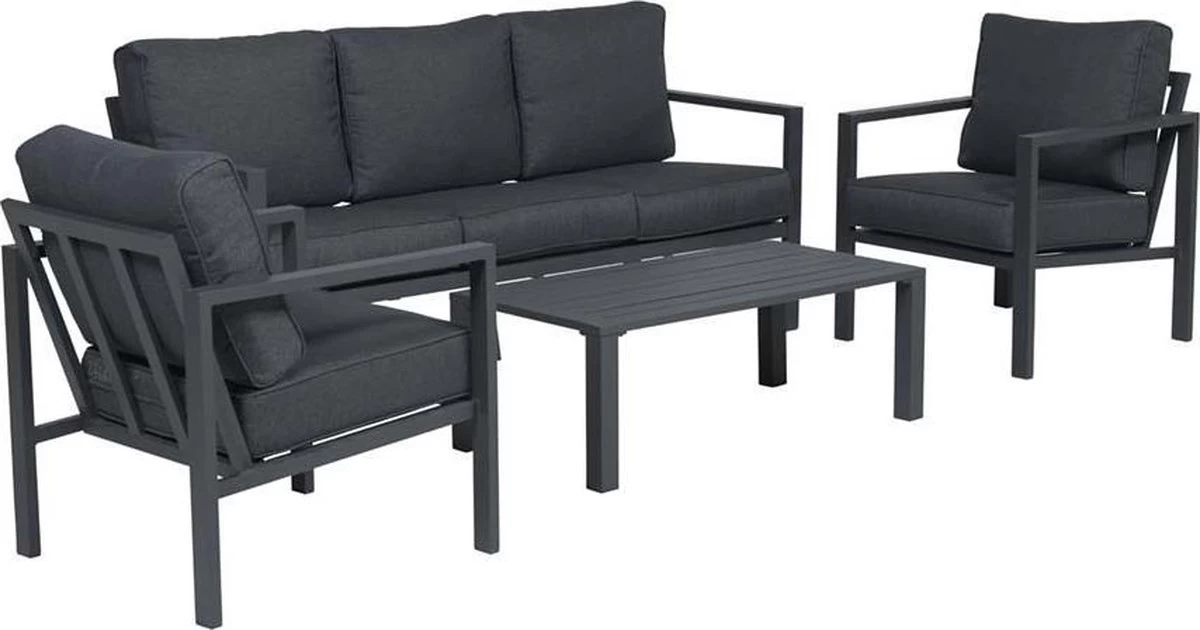 De set bestaat uit een driezitsbank met koffietafel en twee stoelen. Het frame van de set is gemaakt van aluminium met een beschermende poedercoating. Aluminium is uitermate geschikt voor gebruik buitenshuis, omdat het eenvoudig te onderhouden, gemakkelijk schoon te maken is en een moderne uitstraling heeft. De dikke loungekussens worden standaard meegeleverd en hebben een waterafstotende coating. Water van een korte regenbui kun je eenvoudig van het kussen af kloppen. Mocht je de kussens een niet gebruiken, dan raden wij aan deze schoon en droog op te bergen.