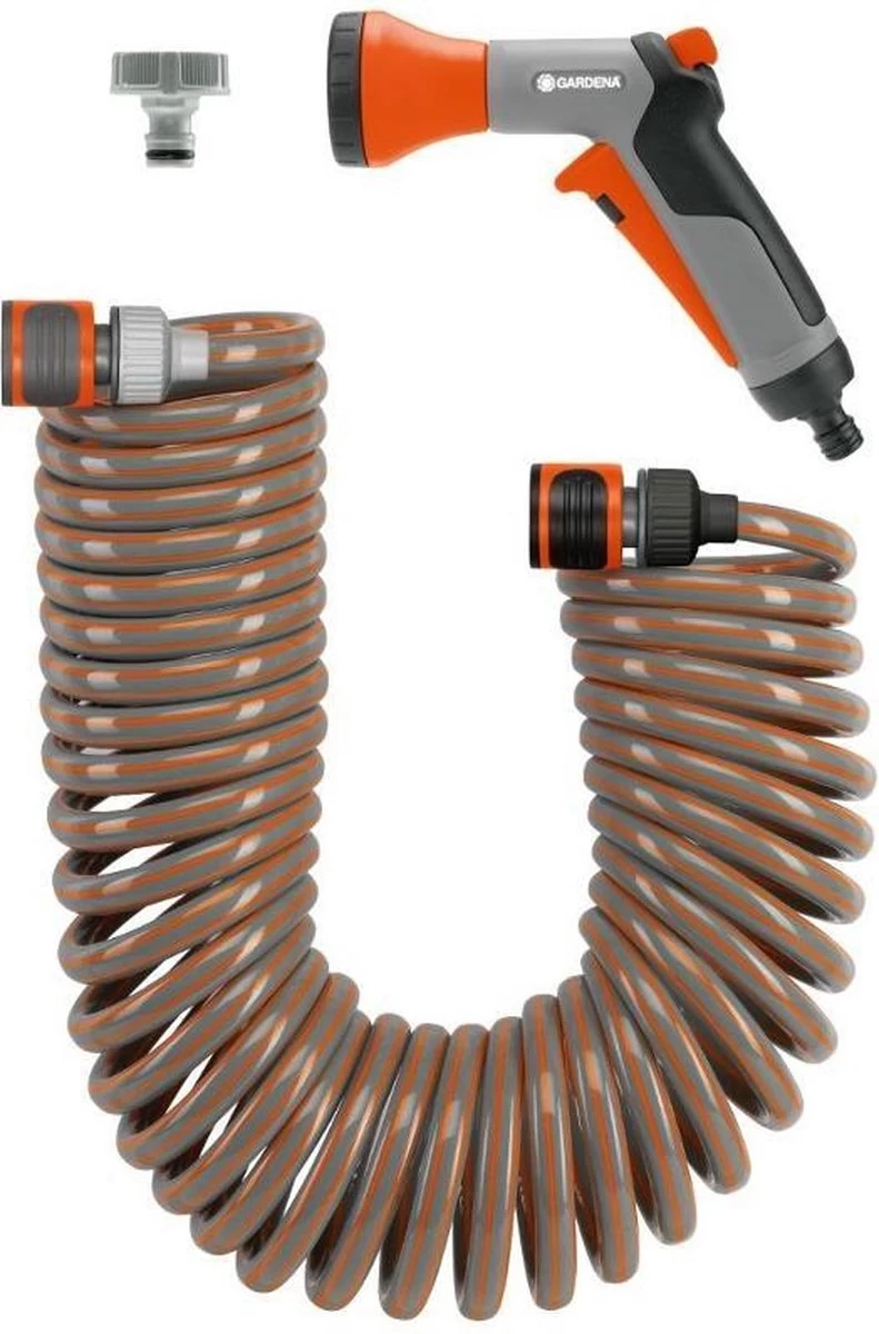 De spiraalslang-set is de handige oplossing voor het water geven van planten op balkons of terrassen of in zeer kleine tuinen. De slang wordt aan de muur gemonteerd. na gebruik veert de slang automatisch weer terug tot minimale afmetingen, dat maakt lastig opβ’ en afrollen van de slang overbodig. De slanglengte is 10 m, ideaal voor het water geven van planten op kleine oppervlakken. de meegeleverde pistoolbroes ligt goed in de hand, de waterhoeveelheid kan traploos worden geregeld en de impulsgreep kan desgewenst worden ingesteld. De gardena spiraalslang-set is het praktische en complete systeem voor het sproeien van kleine tuinparadijsjes. Met pistoolbroes (art.nr. 8120) en kraanstukken (art. nr. 900, 901 en 902).