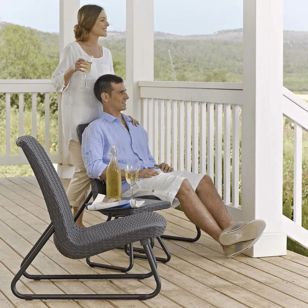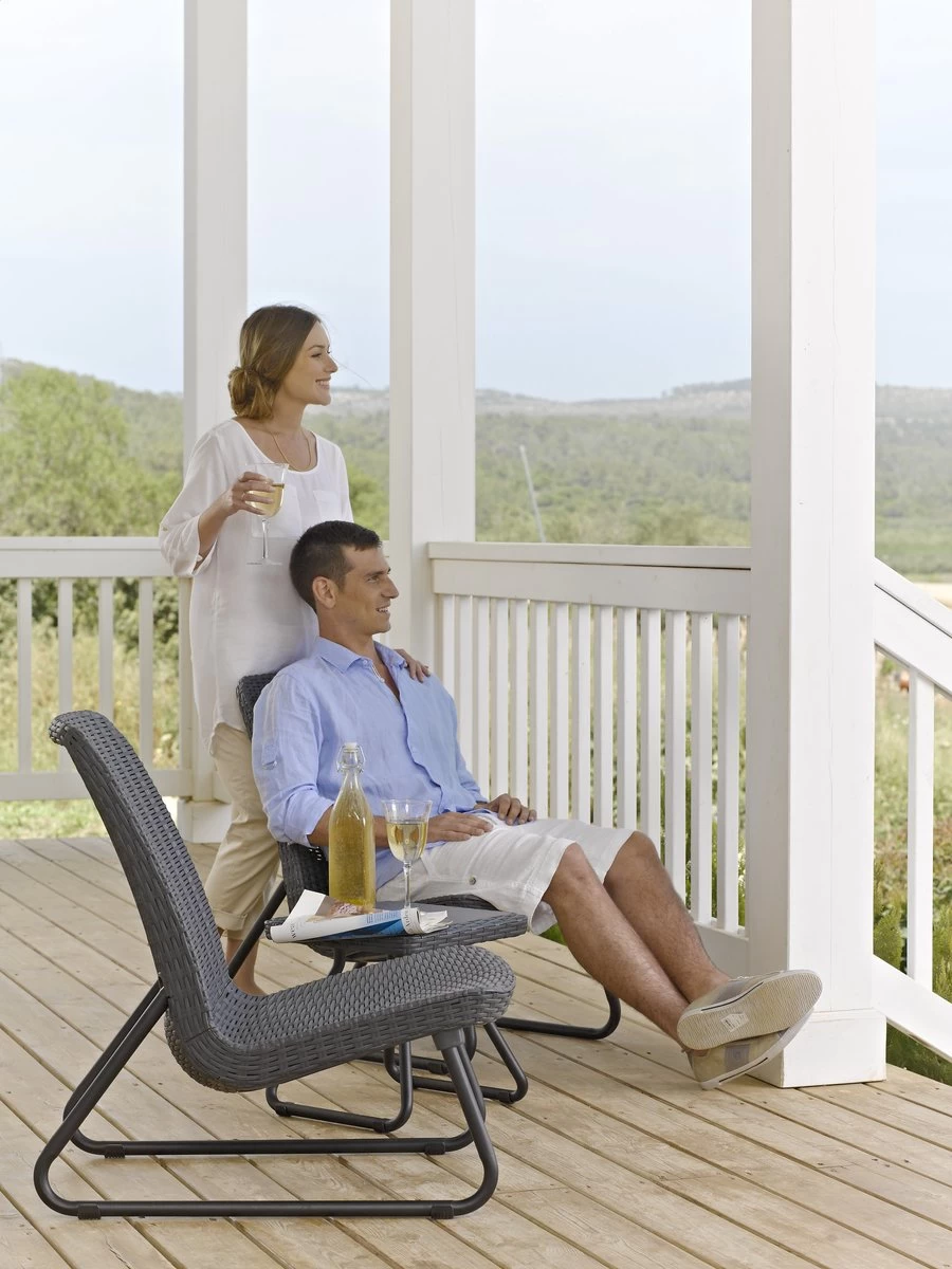 Deze compacte Keter Rio Loungeset past in elke tuin of op ieder balkon en is een uitstekende set om op de zwoele zomeravonden heerlijk in te ontspannen. Het achterover hellende zitvlak zorgt namelijk voor een goed zitcomfort. Het loungesetje bestaat uit twee stoelen en een kleine tafel en is snel en eenvoudig te monteren. De set is voorzien van een modern wicker design. Het kunststof materiaal zorgt ervoor dat de set onderhoudsvrij, weerbestendig en ontzettend duurzaam is. Deze set is compact en daarom ideaal voor kleine terrassen en tuinen. U kunt de Rio Patio balkonset dus het gehele jaar buiten laten staan.