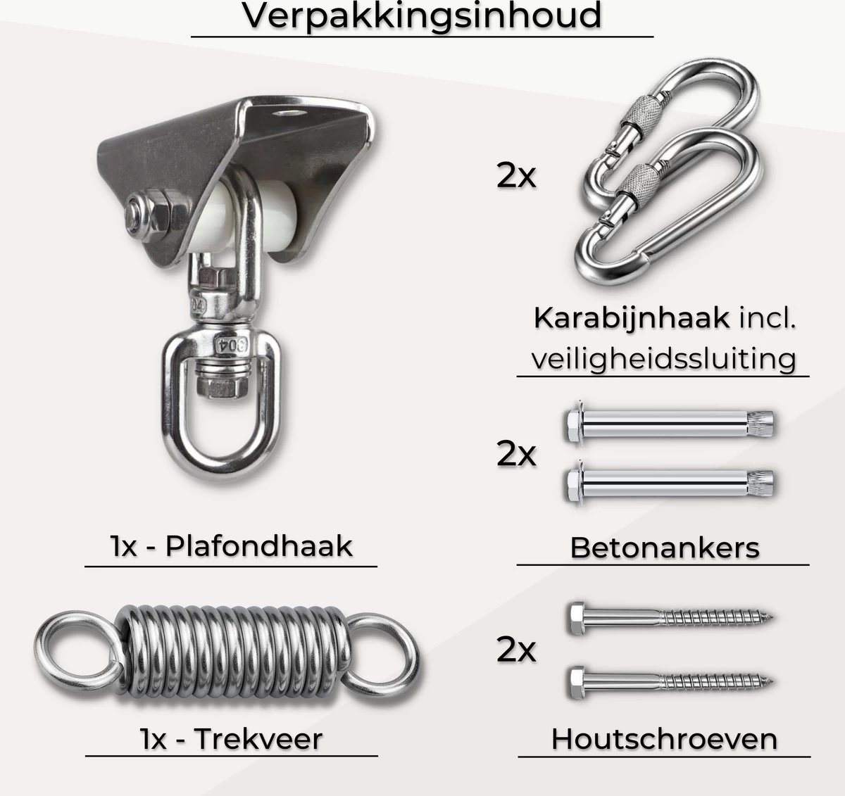 - LFSY bied de veiligheid binnen handbereik: hoogwaardige haken die gemaakt zijn van hoogwaardig roestvrij staal (gegalvaniseerd) en zijn te monteren op zowel beton als hout. Het draagvermogen bedraagt ca 450 kg, wat voldoende is om te voldoen aan de veiligheidseisen van verschillende toepassingen, ook zit er een schroefknop op de karabijnhaak deze bied extra veiligheid voor elke toepassing.
