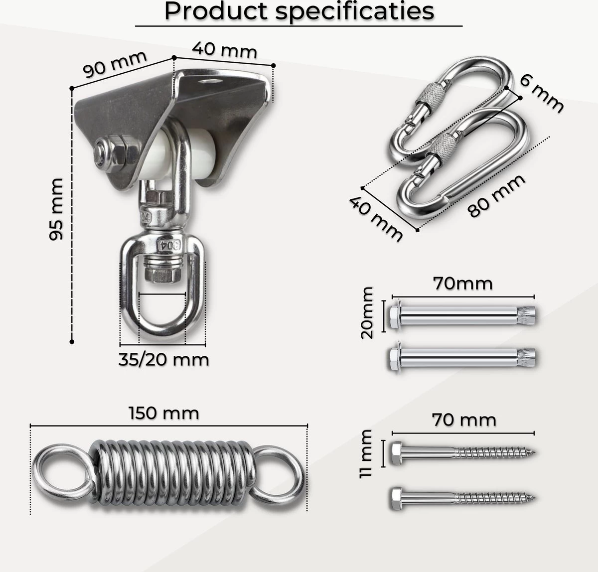 Deze set bied ook mobiliteit op verschillende manieren zoals is de swing van de schommelhaak beweegbaar tot wel 180 ° en kan de beugelkop tot wel 360 ° roteren. Ook bied deze montageset een veer, deze veer bied een lichtelijke veerbeweging bijvoorbeeld in het zitten van een hangstoel, schommel of hangmat. Deze veer “veert” alleen bij hogere draagcapaciteiten.