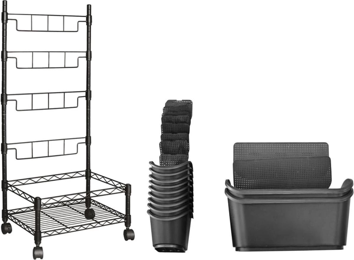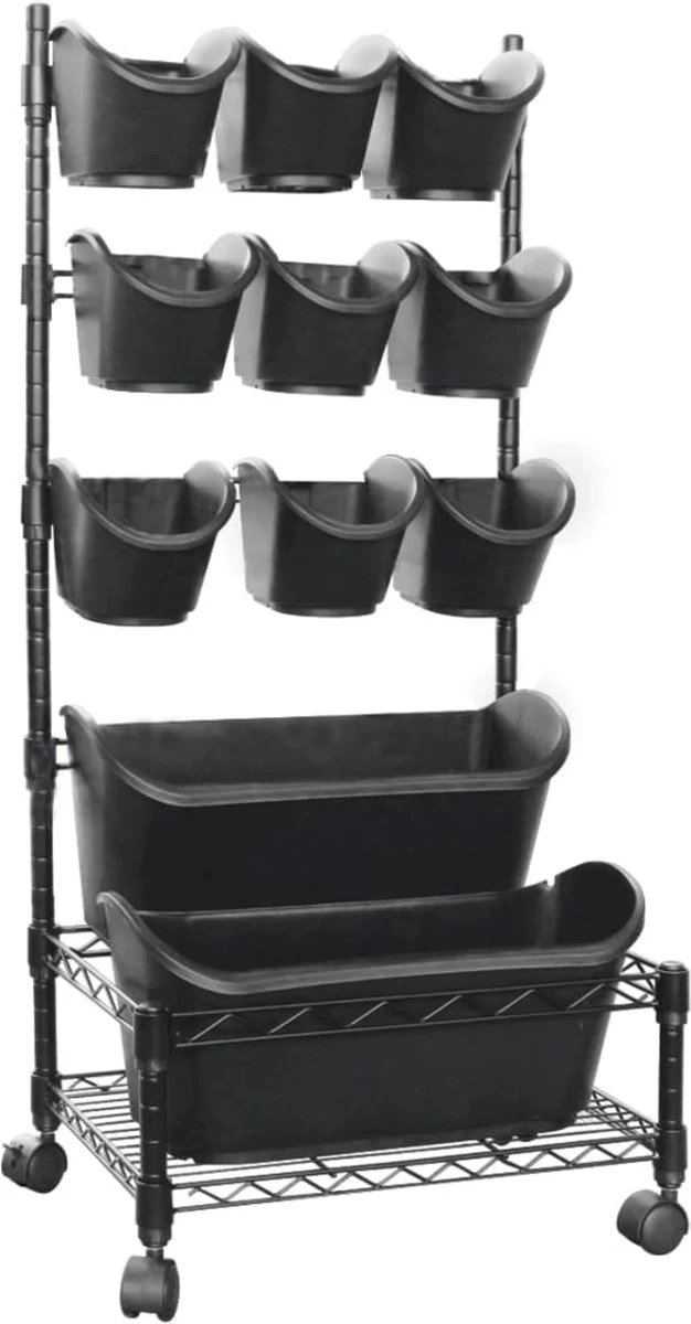 De verticale mobiele tuin van Nature bestaat uit negen vierkante potten (elk 0,9 L), twee grote rechthoekige plantbakken (elk 5,4 L) en het metalen frame op wielen.