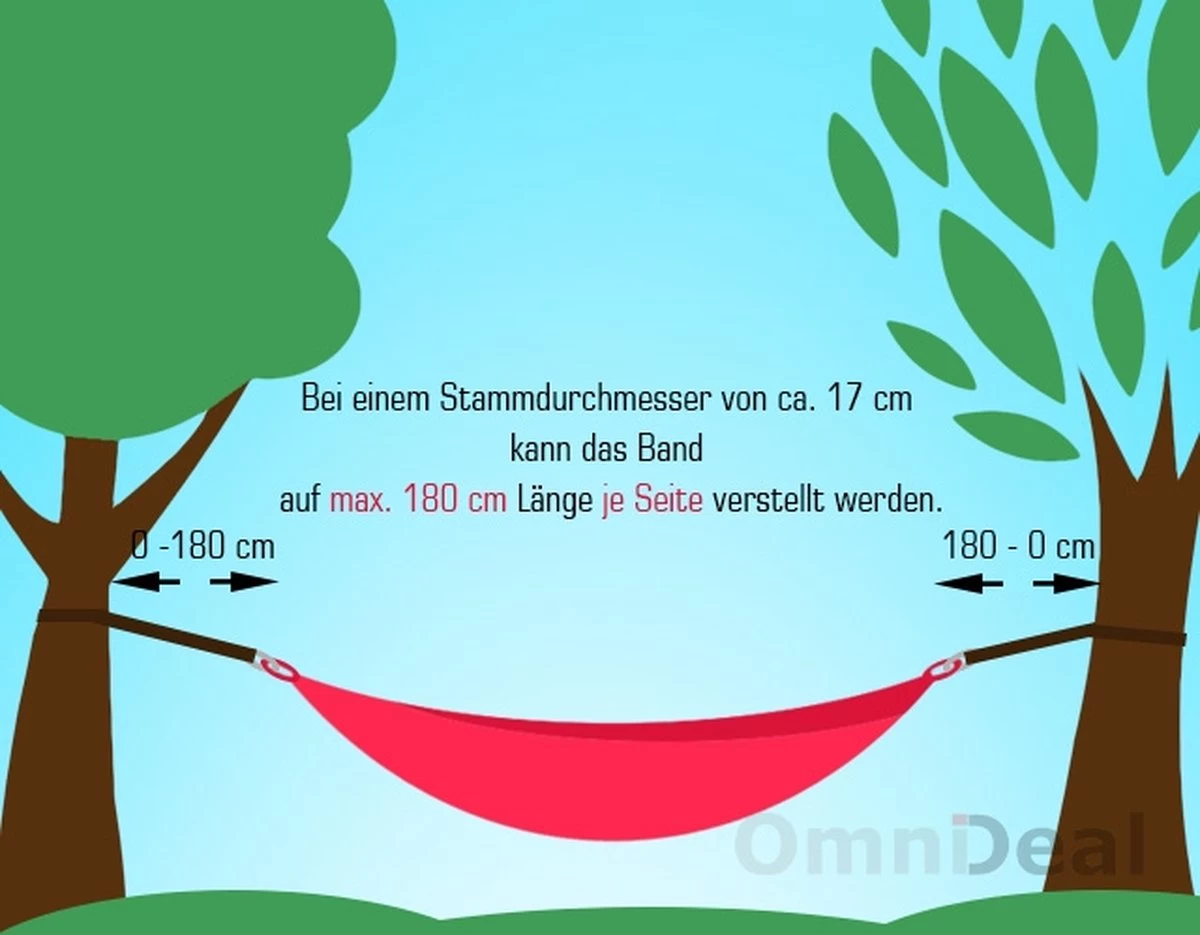 Smalle bevestigingsriemen worden niet alleen sneller broos, ze kunnen ook de boomschors beschadigen. De 5 cm brede hangstoel bevestiging doet geen enkele boom uit. Bij hoge trekkracht wordt de druk boomvriendelijk en gelijkmatig verdeeld. Elke riem is 3,20 m lang, ook brede boomstammen of hoge takken vormen dus geen probleem.
