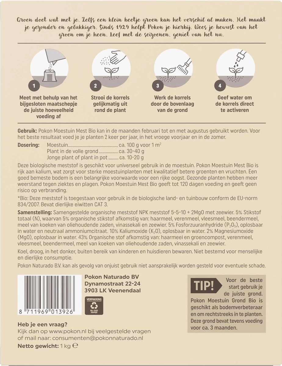 Jouw moestuin verdient het allerbeste en dat is precies wat je in huis haalt met Pokon Bio Moestuin Mest. Deze meststof is speciaal ontwikkeld om sterke en gezonde groente, fruit en kruiden te kweken, mede dankzij voeding dat tot wel 120 dagen meegaat. Zo eet je bijvoorbeeld gezonde en lekkere tomaten uit je eigen biologische moestuin met deze 100% natuurlijke (tomaten) meststof.