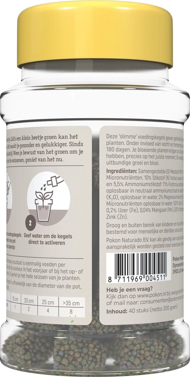 Pak het benodigde aantal voedingskegels. Maak voor iedere kegel een kuiltje naast de plant van zo’n 5 cm diep. Plaats hierin de voedingskegel. Bedek het kuiltje met potgrond. Geef de plant water om de voedingskegel(s) te activeren.