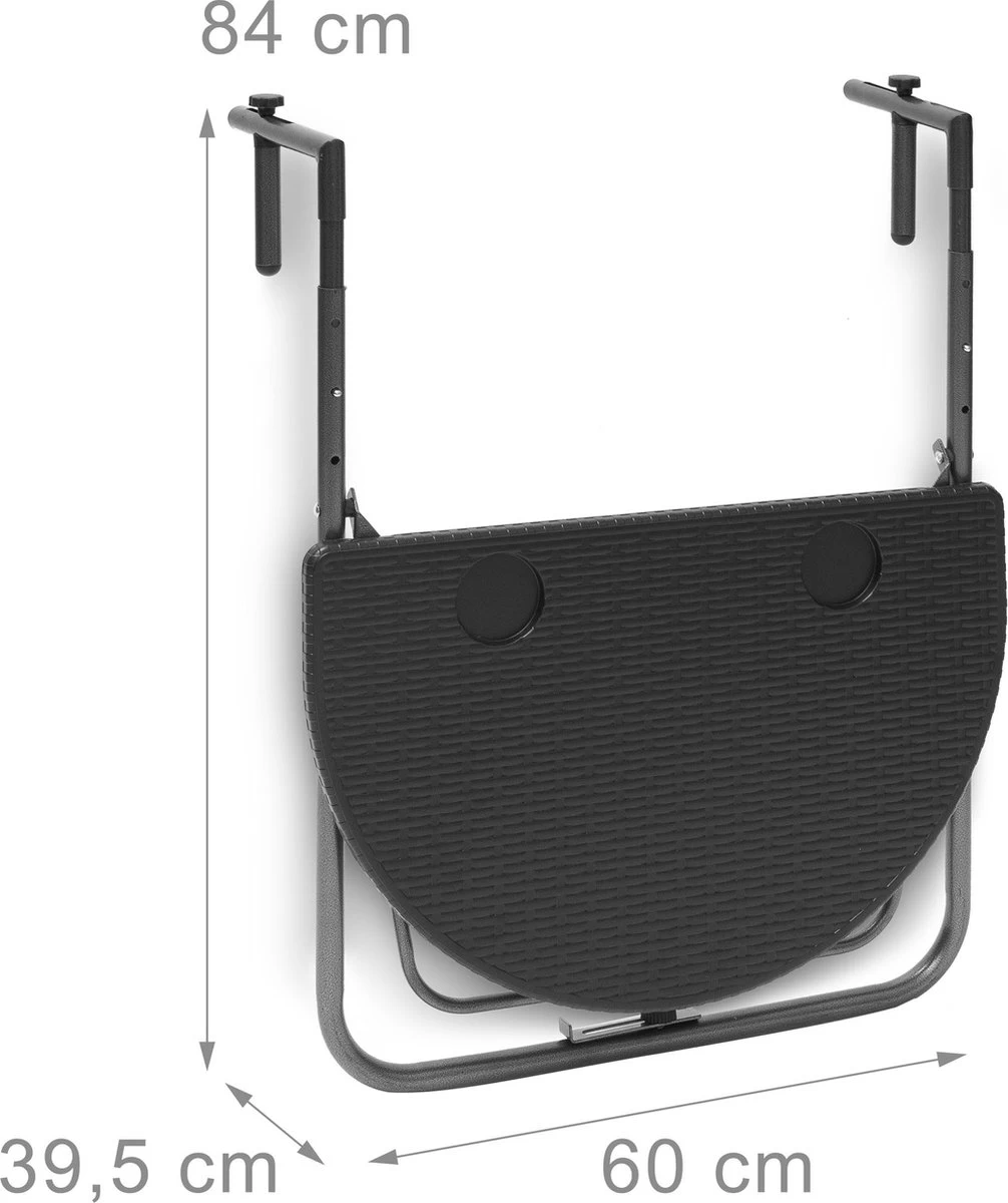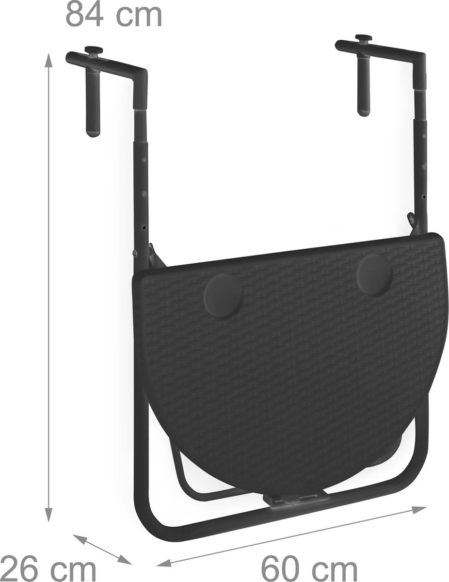• Balkontafel opgeklapt met frame H x B x D: ca. 84 x 60 x 26 cm (3 cm afstand van reling)