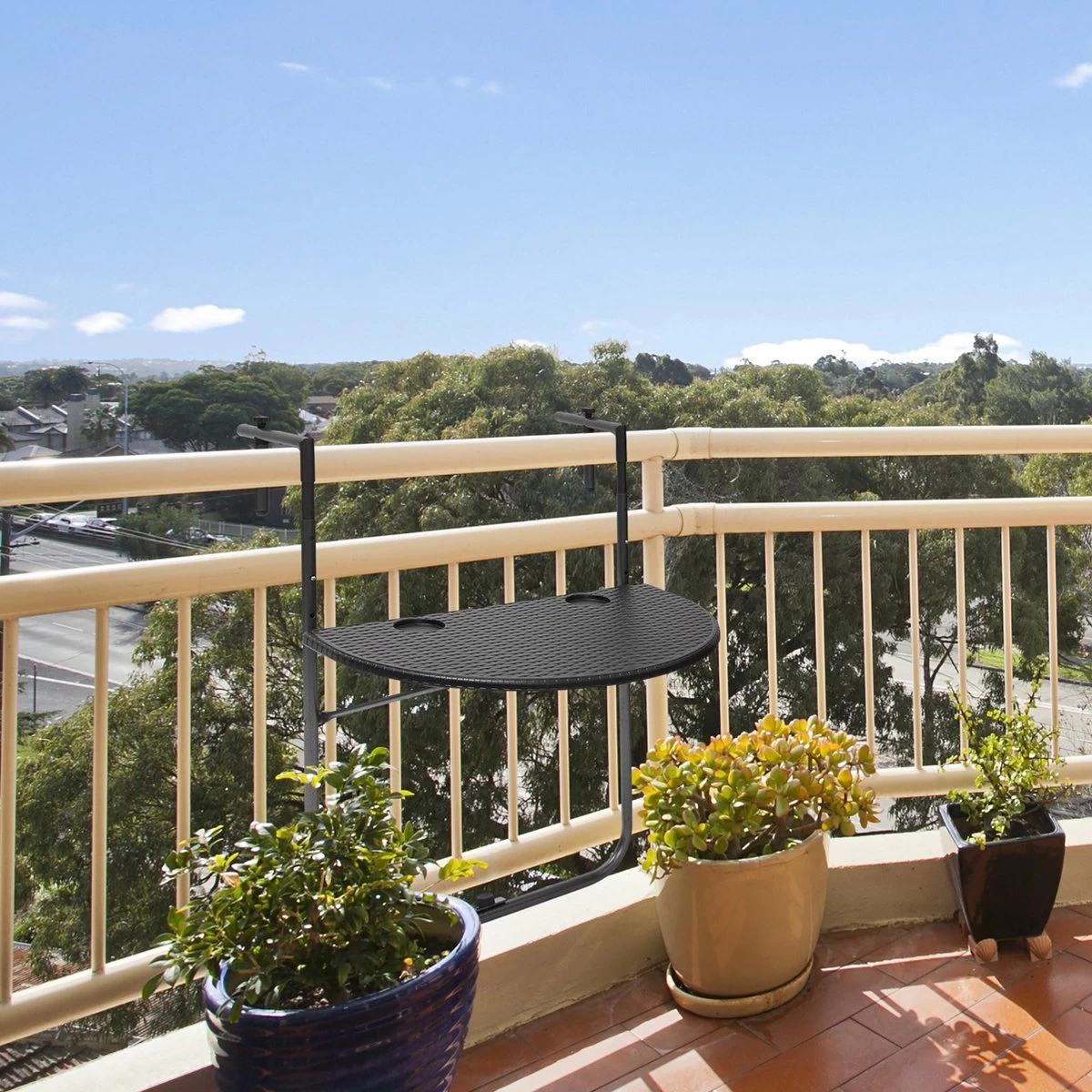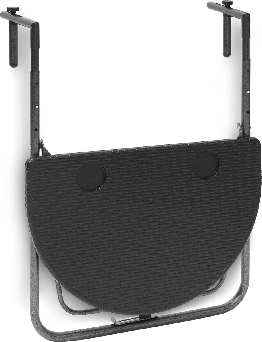 De balkontafel BASTIAN kun je eenvoudig over de reling van het balkon hangen. De hoogte van de tafel kan op drie niveaus ingesteld worden om er voor te zorgen dat de tafel altijd de juiste hoogte heeft onafhankelijk van hoog hoog de reling is.