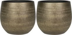 Set van 2x stuks plantenpotten/bloempotten in een strakke glanzende modern design look metal goud Dia 22 cm en Hoogte 20 cm. Deze duurzame bloempotten zijn handgemaakt en geschikt voor binnen. Serienaam Ryan. Materiaal: keramiek. Niet vorstbestendig. Past goed in vele inrichting stijlen en valt op door zijn tijdloze eenvoud.