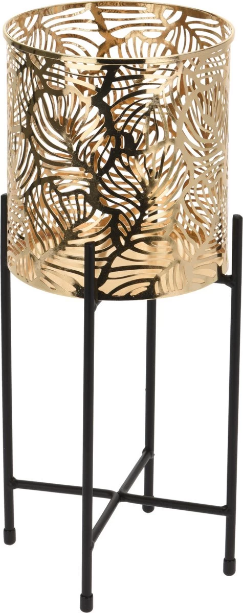 Set van 2x stuks luxe plantenpotten/bloempotten goud kleurig metaal van 14 x 15 cm op een zwarte metalen standaard. Hoogte: 1x 35 cm en 1x 45 cm. bestaande uit 1x Plantenpot goud op metalen standaard – 35 cm hoogte, 1x Plantenpot goud op metalen standaard – 45 cm hoogte